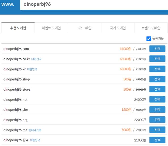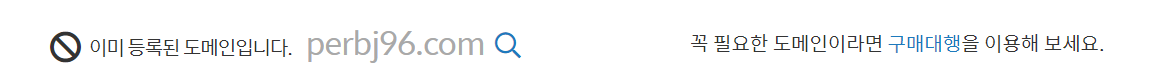 위 주소는 제가 갖고 있는 도메인이기 때문에 이미 등록된 도메인으로 나옵니다. 꼭 필요한 도메인이라면 구매대행을 이용해보라고 하는데 넘어가겠습니다. 다른 주소로 수정해서 dinoperbj96으로 입력을 해보았습니다.