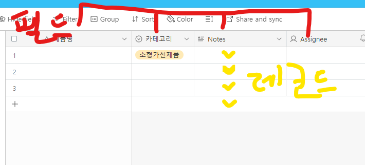 - 기본키인 Primary Field! A라고 적혀있는 가장 좌측의 필드에 마우스 우클릭 후 Edit Field 로 이름을 [제품명]이라고 바꿔주세요. 속성은 single line text입니다.