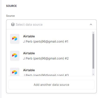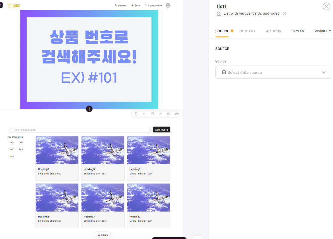 softr로 돌아와 리스트 블록을 클릭후 활성화된 우측 사이드바에서 source를 클릭해 아까 회원가입을 한 airtable 계정으로 로그인 해줍니다. 그러면 source에 계정이 나올텐데 가장 상단의 #1 선택해주세요 > 그러면 아래 base 단계가 보이게 되고 생성한 테이블이 나옵니다. 이름 확인 후 선택해줍니다.