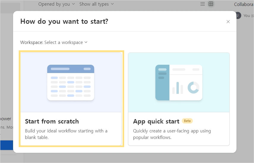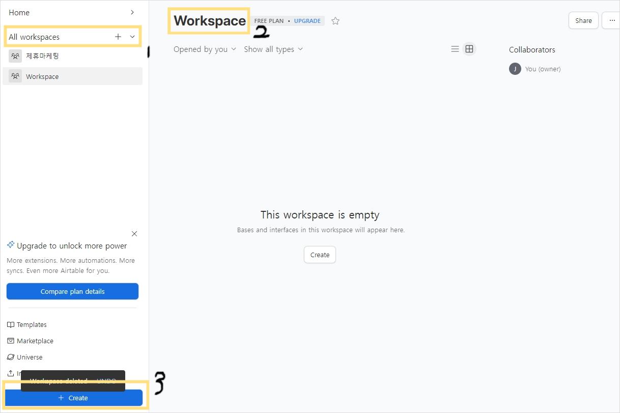 로그인이 끝났다면 보시는 화면처럼 Home 화면으로 이동할 것입니다.좌측의 All workspaces 클릭 해서 새로운 workspace를 생성해주시고 2번 부분을 눌러 워크스페이스의 제목을 변경해줍니다. 그리고 변경이 완료되었다면 좌하단의 + create 버튼을 클릭해 start from scratch 를 클릭하여 구글 시트와 같은 테이블을 만들어줍니다. 이때 위에 workspace를 선택해주시는데 방금 생성한 워크스페이스를 선택하여 해당 워크스페이스에 테이블을 생성해주도록 하겠습니다.