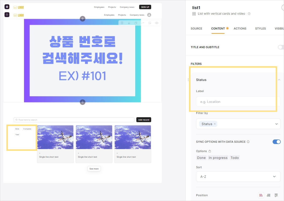 아까 위에서 만들어두었던 airtable의 필드와 매칭이 된 것을 확인할 수 있습니다. 반영이 안되었다면 source의 refresh 하시면 되시고요. 그 아래 see more button이 있습니다. see more가 더보기인데 한국인을 대상으로 할 것이니 한글로 바꿔줍시다. content까지 완료 되었습니다.