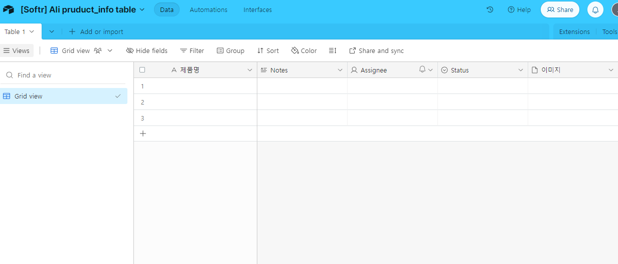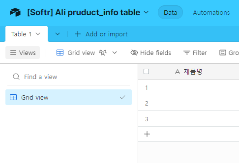 저는 식별을 직관적으로 하기 위해 [Softr] Ali pruduct_info table 로 테이블 명을 정했습니다. 우선 위 화면처럼 테이블이 생성됐다면 우선 softr와 연동할 준비는 되었습니다.