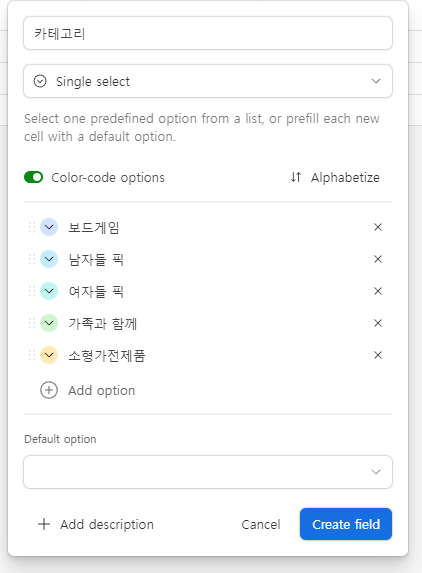 그 아래 Firter by는 카테고리를 어떻게 구분할 것인지를 정하는 것입니다. airtable에서 정의를 해준 적 없기 때문에 정의를 해주어야 합니다. (앞으로 위 열을 field (필드) 아래 열들을 record(레코드)라고 하겠습니다.) airtable로 돌아와 필드의 맨 우측을 빈 필드를 클릭해 새로운 필드를 만들어줍니다. 이름은 카테고리로 하고 형태는 Multiful select 으로 선택해줍니다. 그리고 아래 옵션을 내가 제휴마케팅에 올릴 제품들 카테고리로 나눠서 save 해주시면 됩니다.