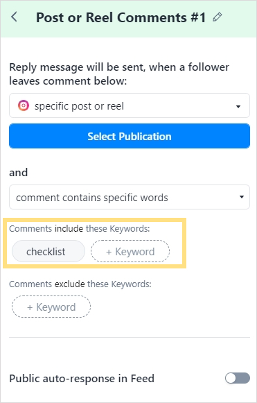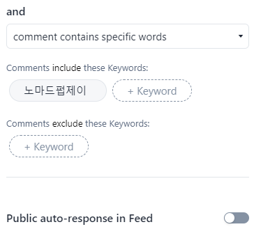 포스트나 릴스를 선택해주었다면 키워드를 입력해줍니다. 저는 노마드펍제이로 키워드를 설정했습니다. 위 이미지는 예전 manychat 캡쳐 화면인데 지금이랑 크게 바뀐점은 없으니 계속 따라와주세요. 그리고 나면 피드에 답장을 선택할 수 있는 창이 나옵니다. 노마드펍제이로 남겨주신 분들에게 대댓글이 남겨지게 되는데요. 저 아래 세 문구 중 하나가 랜덤으로 남겨지게 됩니다.