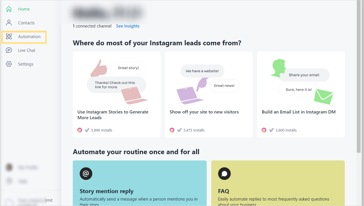 홈 화면으로 가시면 위 이미지처럼 보이실 텐데요, 왼쪽 매뉴 보시면 좌측 세 번 째 AUTOMATION이라고 적혀있습니다. 클릭 해주세요 그리고 우측 클릭해주시면 + New Automation이 있습니다. 클릭해주세요. convert your instagram comments