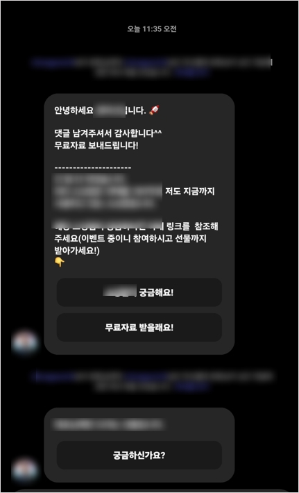 댓글을 남겼더니 위와 같은 문구가 DM으로 발송됩니다. 잘 되네요^^ 다만 DM이 보내지지 않는 오류가 있을 수 있는데요, 이때는 팔로우를 해달라고 해보세요. 감사합니다.
