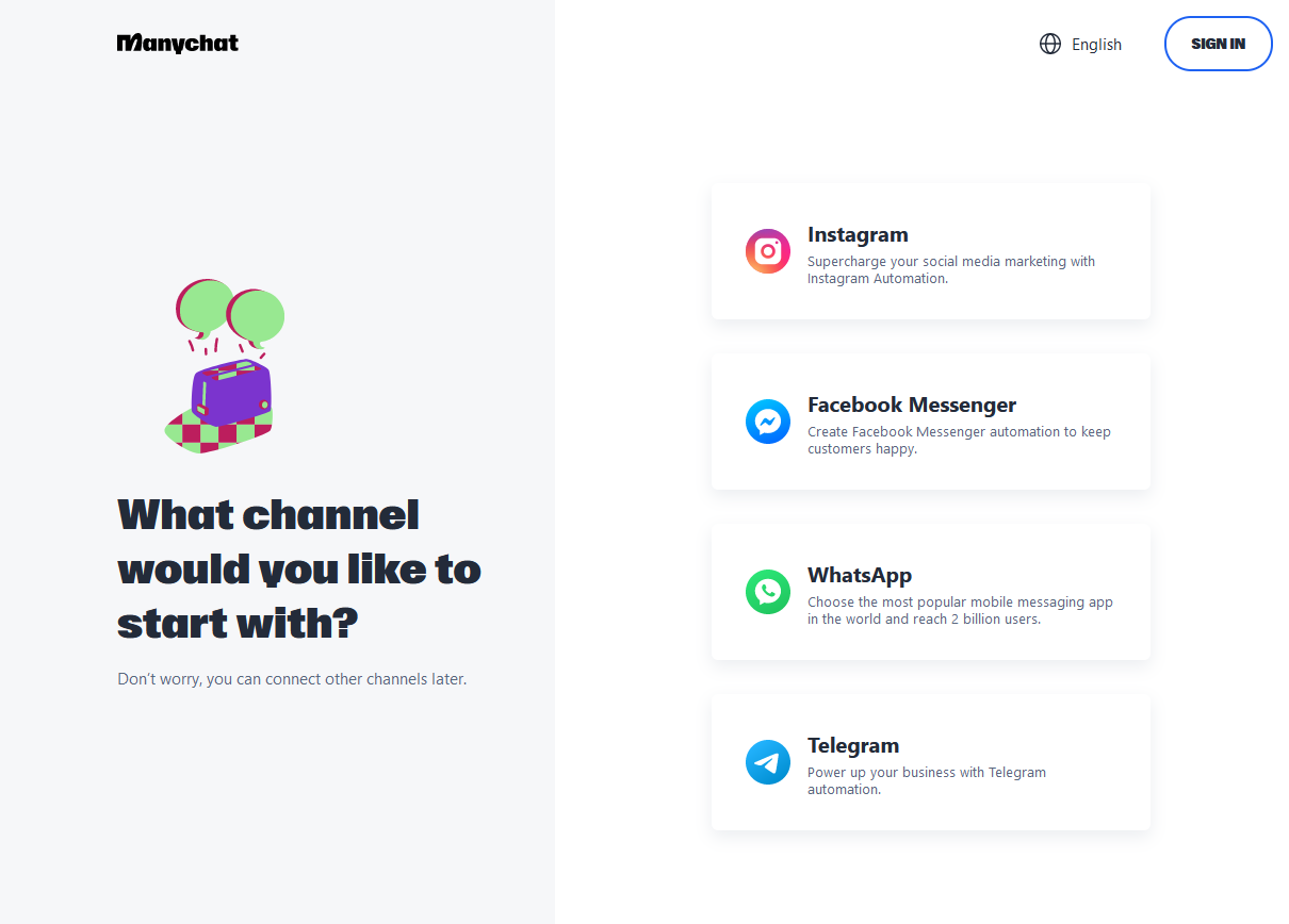 매니챗( 매니챗 바로가기 링크) 홈페이지에 접속한 뒤 우측 상단의 SIGN IN을 눌러줍니다. 그러면 위와 같은 페이지가 나오는데, 인스타그램 자동DM으로 퍼널마케팅 시도하려고 하는 것이기 때문에 인스타그램을 눌러주세요! 근데 어차피 인스타그램을 눌러도 페이스북을 연동하라고 나옵니다.