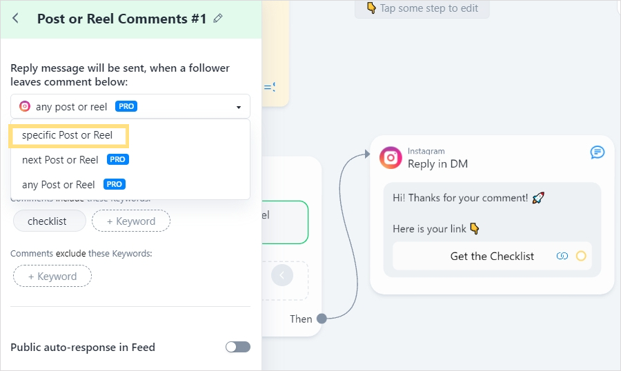 좌측 when 아래 user comment on your post or reels 클릭해주세요 그러면 specific post reel 눌러주세요. 모든 게시물이나 다음 게시물 릴스를 선택해도 되지만 특정 게시물을 퍼널로 할 것이기 떄문에 특정해주도록 하겠습니다. 그리고 아래 기능은 pro에서 이용이 가능합니다.